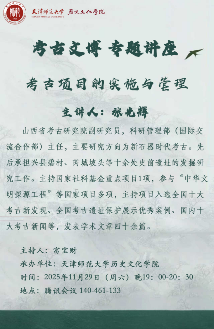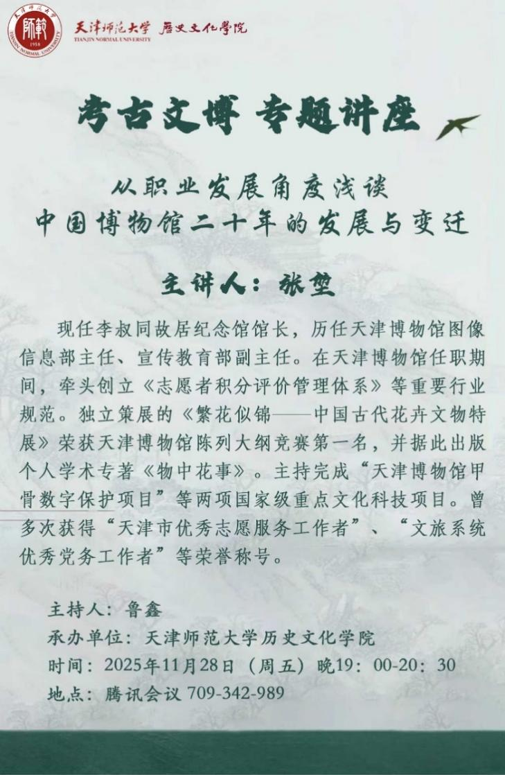 为充分发挥行业导师的指导作用,拓展文博专业学生学术眼界,明确未来继续深造与就业方向,2025年11月25日至29日,历史文化学院先后邀请3位行业导师为文博专业的本科生带来三场以“考古文博行业前沿暨人才需求”为专题的线上讲座。