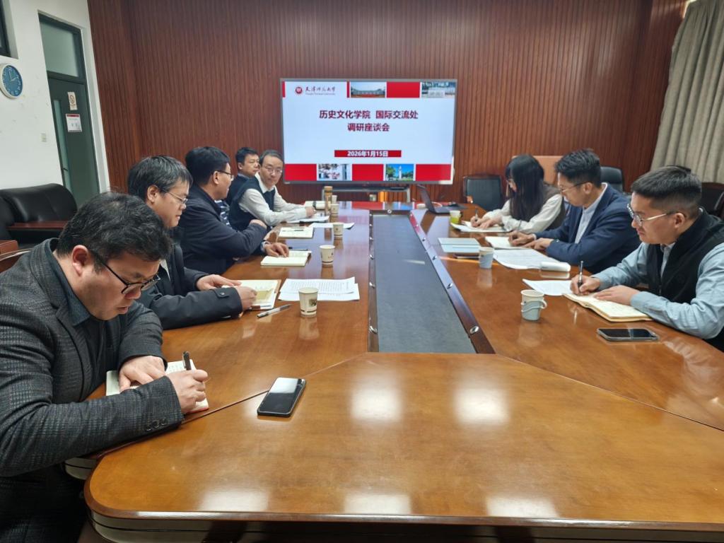 为深入对接国家战略需求,赋能国别和区域研究高层次人才培养,提升国际化办学水平,2026年1月15日下午,国际交流处处长刘桐、办公室主任冯元、港澳台事务科科长马宏伟一行来到历史文化学院开展专题调研座谈。历史学联合党委副书记、历史文化学院院长张乃和,学院科研副院长张玉兴,考古学学科带头人白国红,文博系系主任鲁鑫,世界史系副主任陈金鹏,院办公室主任周二保参加座谈。