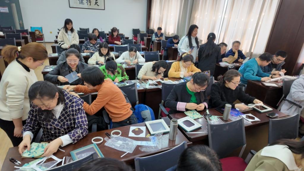 女教职工们凝神创作,剪刀裁开流光溢彩的宋锦边角料,镊子轻夹莹润珍珠,在木质相框中构筑立体春景。现场笑语盈盈,偶有轻声探讨纹样寓意,偶有惊喜展示半成品,传统文化在协作中焕发新生机。一小时精心雕琢后,“蝶恋花”“德芳雅瓶”等作品惊艳亮相。