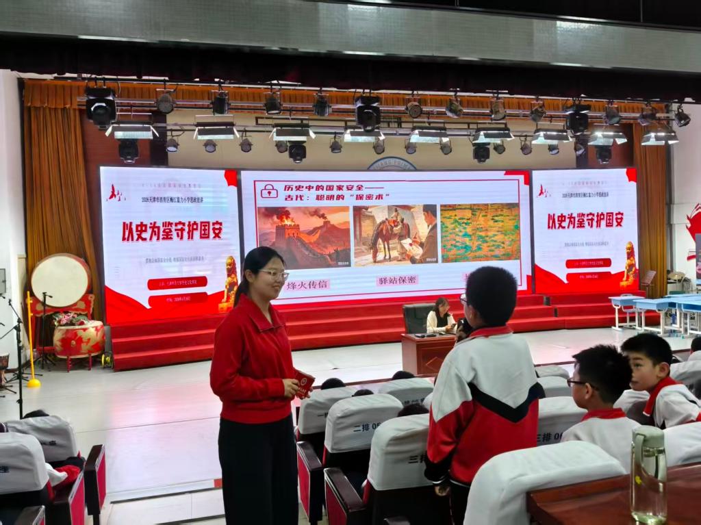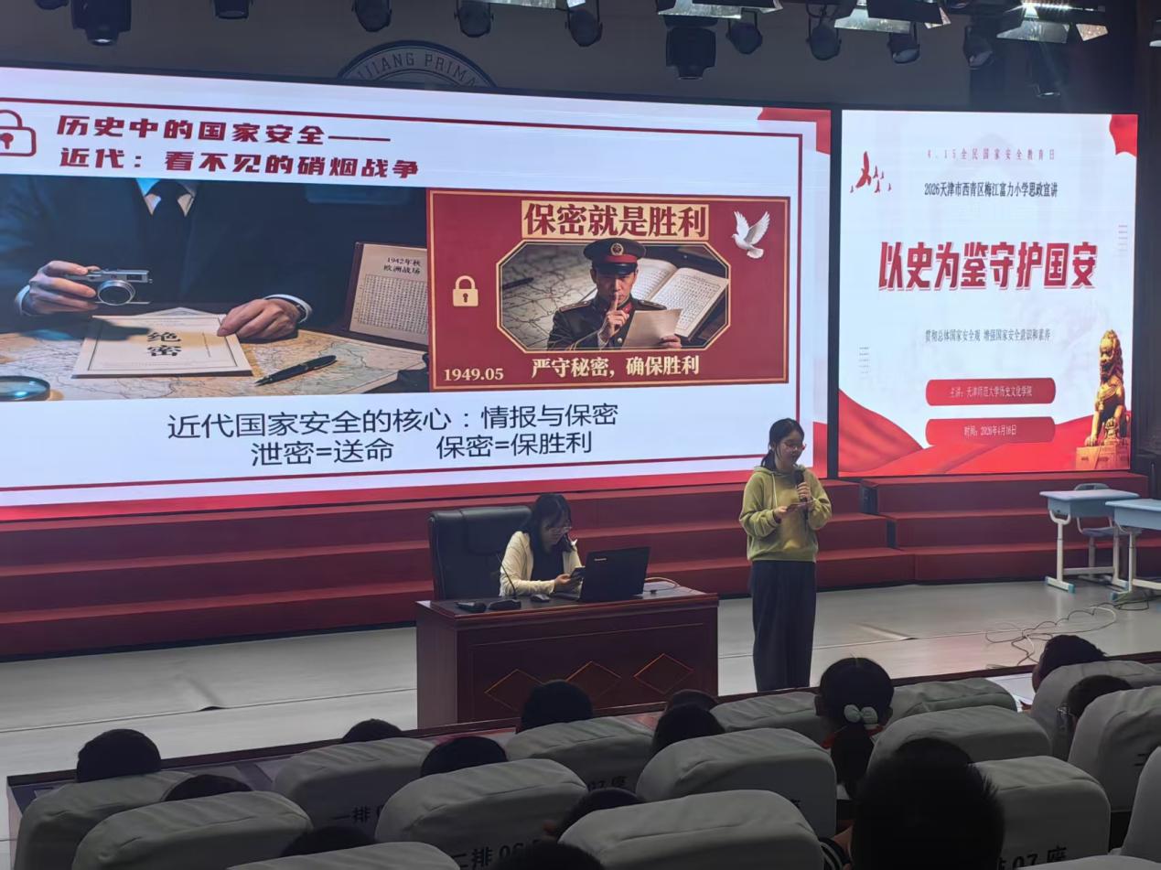 为深入贯彻总体国家安全观,增强青少年国家安全素养,引导学生树立“国家安全、人人有责”的意识,天津师范大学历史文化学院团委组织“青马工程”培训班学员,走进天津市西青区梅江富力小学,开展“国家安全记心间,争做国安小卫士”主题宣讲活动。活动以古今案例讲解、知识科普、互动游戏等形式,让国家安全知识走进校园、走进童心。