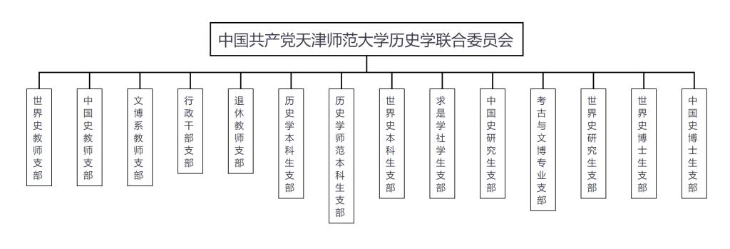 历史学联合党委现共有党员247人,其中教职工党员74人,退休教职工党员33人,学生党员140人。联合党委下属党支部14个,其中在职教师党支部4个,退休教师党支部1个,学生党支部9个。现任党委书记陈元同志,党委副书记、纪委书记(兼)徐显达同志,现任党委委员为:侯建新、陈元、张乃和、徐显达、王玉亮、耿华、张玉兴、陈太宝。联合党委组织构成如下: