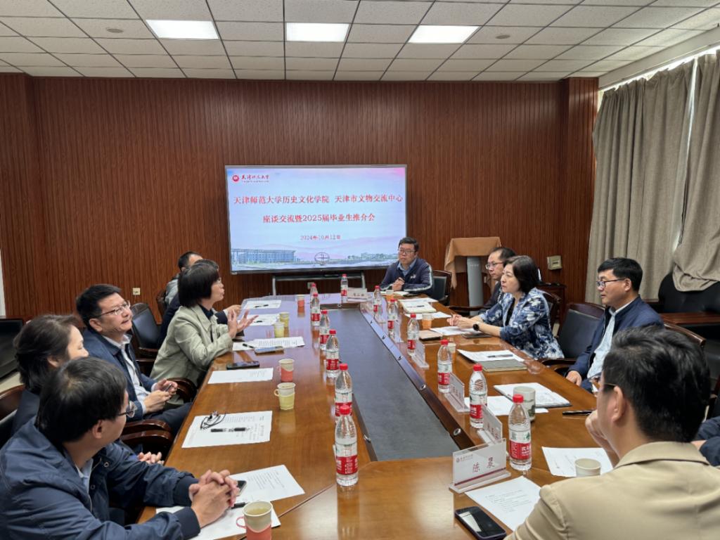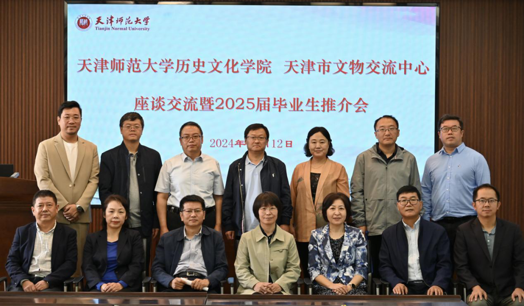 2024年10月12日,我院与天津市文物交流中心举办座谈交流会暨2025届毕业生推介会。历史学联合党委书记陈元,历史学联合党委副书记、历史文化学院院长张乃和,历史学联合党委副书记、纪委书记徐显达,历史文化学院教学副院长王玉亮、科研副院长张玉兴、行政副院长耿华、文物与博物馆学系副主任陈晨、办公室主任周二保,以及天津市文物交流中心党总支书记兼主任王青、副主任信志刚、综合办公室主任李世元、业务发展部主任李春英、业务发展部副主任高廷亮、瓷器专家赵磊等参加会议。