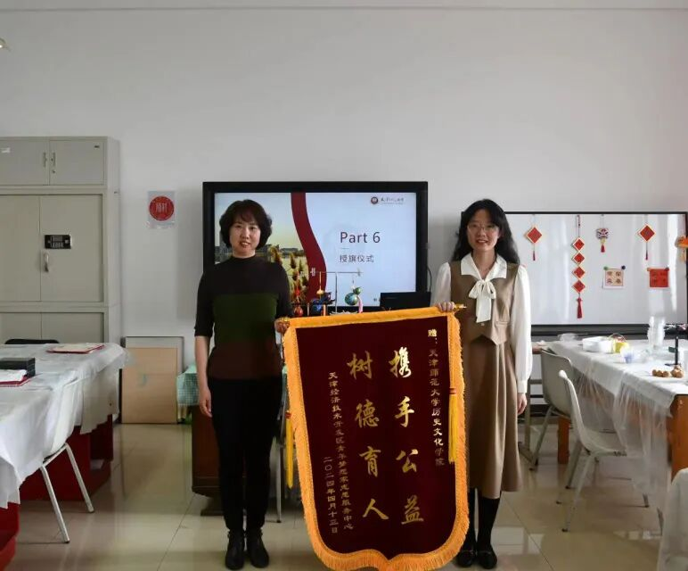在研学团参观校园的同时,青年梦想家志愿服务中心的老师和我院师生开展了志愿者表彰大会和授旗仪式。在过去的一年里,我院志愿者们积极参加各项社区、村镇志愿服务、调研宣讲等活动,协助完成新闻推送制作120余篇。韩璐老师为康韵雯、姜万年等共计六位优秀志愿者代表送上荣誉证书,并为天津师范大学历史文化学院授予锦旗,对学院的鼎力支持、用心服务表示感谢。韩璐老师充分赞扬了我院志愿者的无私奉献的精神、志愿服务精神,白卓让老师从践行四个“善作善成”的角度出发,对历史学子提出不负青春、笃行奋斗的要求。