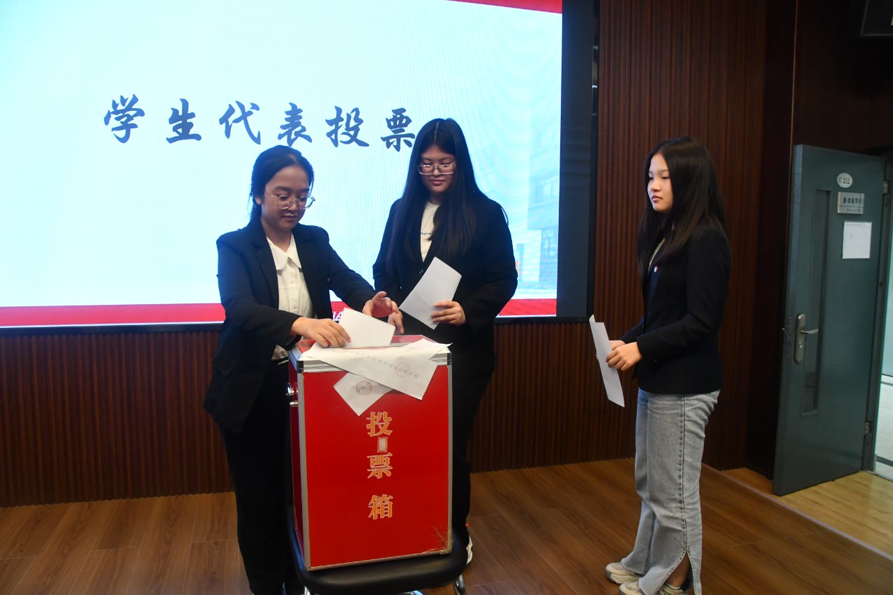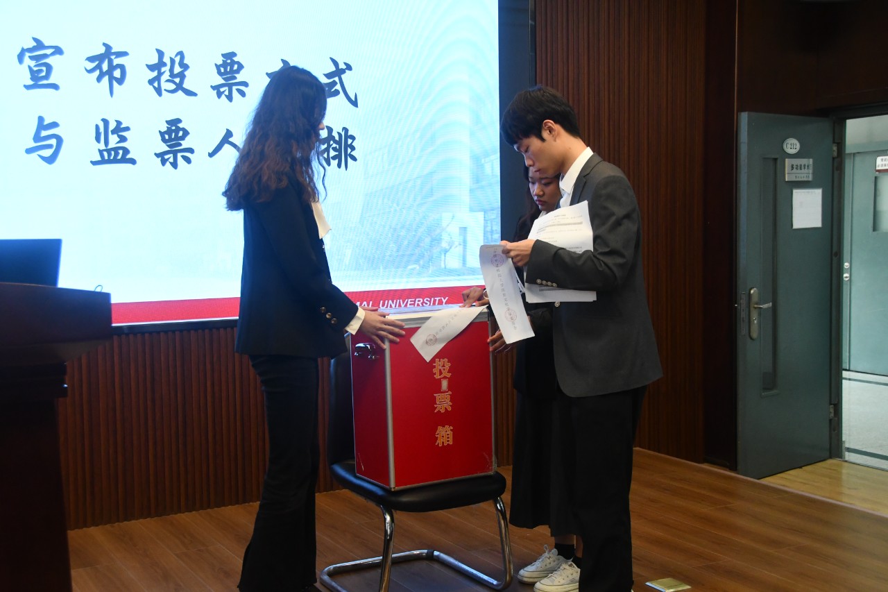 投票阶段。经学院学生会推荐,最终确定吴子同,闫昊,刘芷睿三位同学为监票人。在《选票填写注意事项》宣读完毕后,监票人向同学分发选票并庄严投出自己手中宝贵的一票。