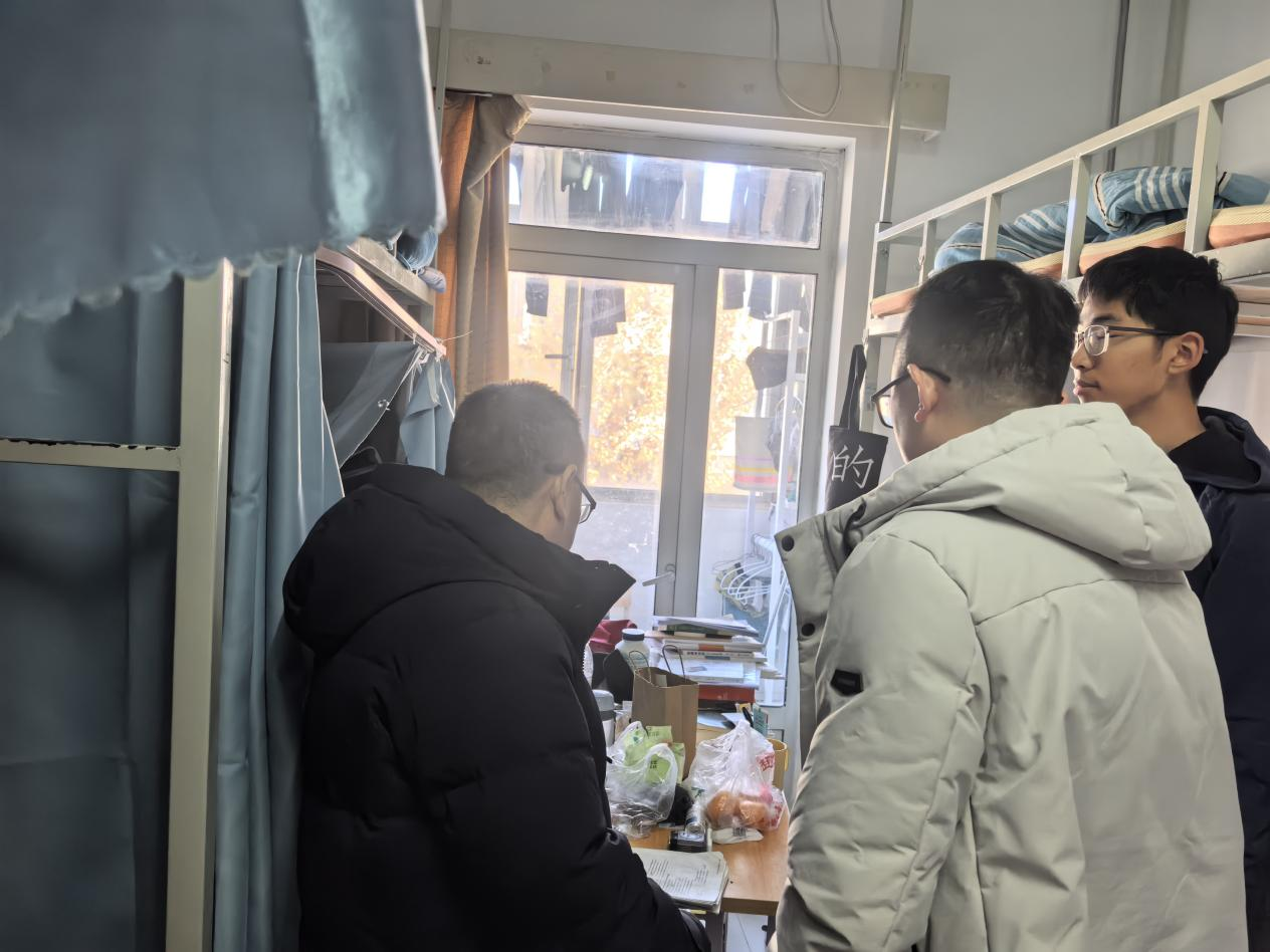 在走访中,学院领导与同学们亲切交流,向同学们宣传消防安全知识,并重申公寓安全“红线”,明确禁止使用大功率加热电器、私拉乱接电路等违规行为,提醒同学们时刻绷紧安全弦,主动维护疏散通道畅通,从细节处防范安全风险。在生活起居方面,走访领导们细致询问宿舍供暖是否充足、生活设施维修是否及时、室友相处是否融洽、日常作息是否规律等生活细节,收集同学们提出的晾晒衣物不便、公共区域保洁频次等问题,现场记录并协调后勤部门跟进解决,将学院的关怀切实融入学生校园安全的方方面面。