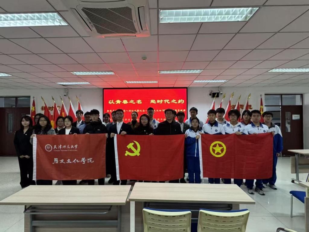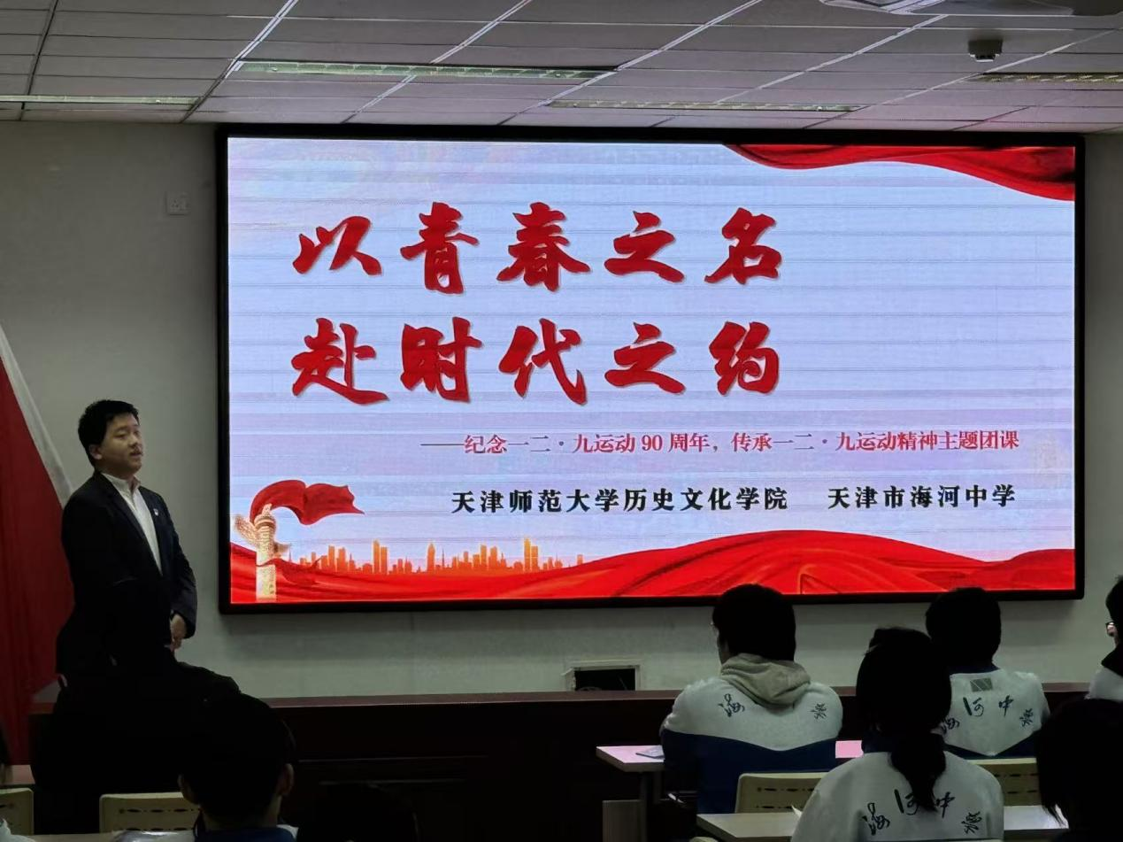 为深入学习贯彻习近平新时代中国特色社会主义思想,传承红色基因,12月8日,天津师范大学历史文化学院赴天津市海河中学开展纪念“一二·九”运动90周年《以青春之名 赴时代之约》主题团课。此次活动,是两校深化合作、协同育人的重要举措。天津师范大学历史文化学院团委书记晏莉、天津市海河中学团委书记段帅帅出席仪式。