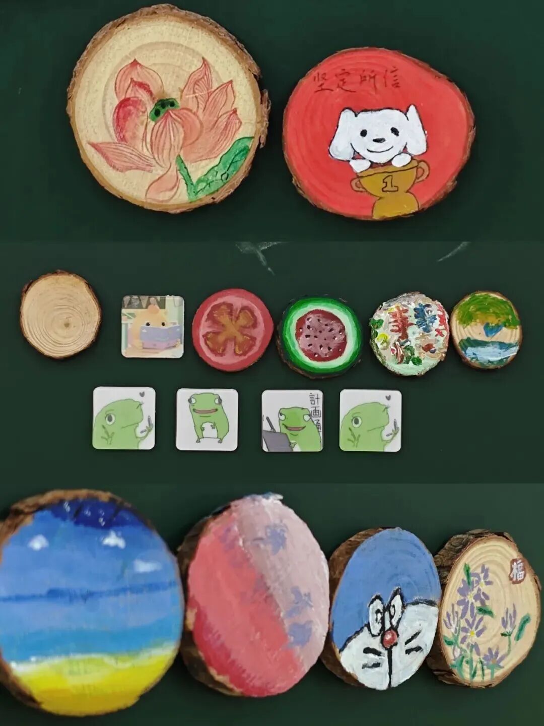 本次活动为同学们准备三款核心创作基材,自带天然年轮肌理的原木片温润质朴,可适配传统纹样复刻、春日诗词书写、山水写意创作等多种风格;清透无痕的亚克力空白冰箱贴灵动轻盈,可定格校园桃枝柳色、绘制软萌卡通形象、书写治愈暖心随笔;主题 DIY 彩绘画具,经典 IP 软萌治愈,零基础也能轻松上手,为同学们的春日创作再添一份童趣与欢喜。